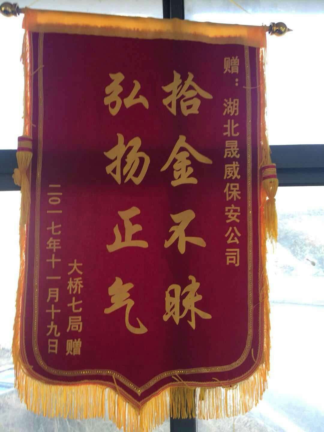 在和失主核实确认后,保人员将其交还给本人。内有大量大桥局图纸资料,手机失而复得,失主非常感激,执意要酬谢保安人员,保安员陈庆波表示:“这是我们应该做的,也是最基本的职业操守。”为表感激之情,失主中国大桥局七局职工于第二天制作了一面“拾金不昧,弘扬正气”的锦旗送到保安员陈庆波手中,对他拾金不昧的精神表示深深的谢意,同时称赞大江鑫港龙城祥和物业公司是一家信得过的公司。
