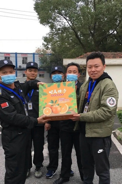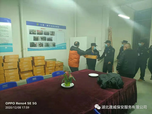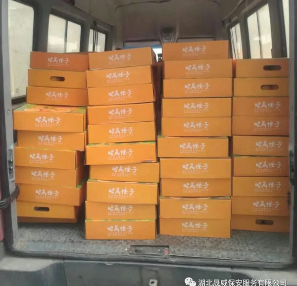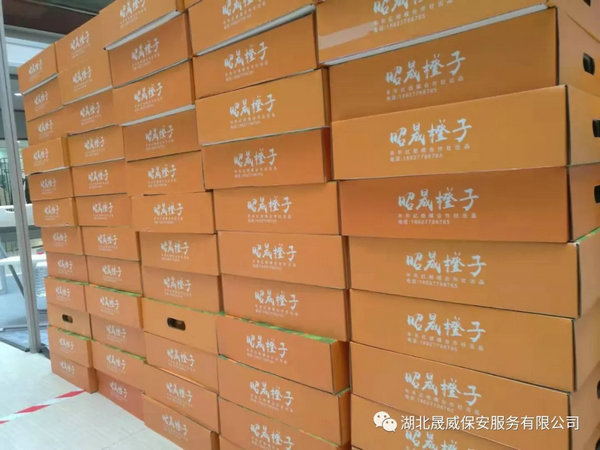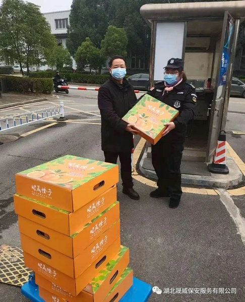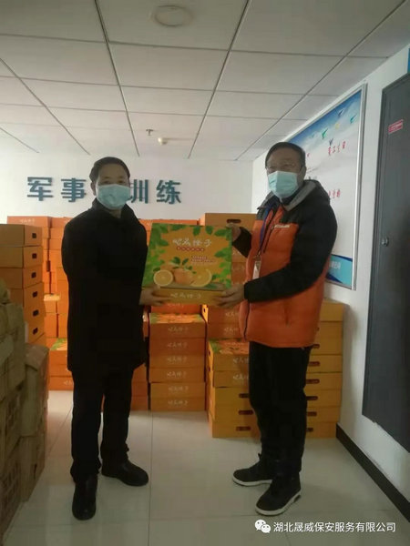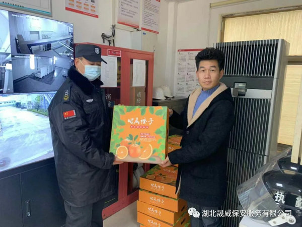 近日,为了帮助兴山县果农做好销售工作,晟威集团公司集中采购2000件2万余斤兴山当地橙子,积极开展消费帮扶活动,为家乡经济发展贡献力量。近日,集团公司副总经理韩庆仪受党总支书记、董事长甘发勇委托,带领集团工会、后勤等部门负责人,深入武汉藤仓烽火、理工光科、华科园、江南新天地等几十个项目点,慰问一线值班值守保安员,并为每个保安员送去昭晟橙子一件,代表集团公司向他们表达问候,并嘱咐他们年底做好安全防护,加强日常巡查,认真值班值守,更加注重精细化的服务,用实际行动为客户单位保驾护航,以优异成绩迎接2021年的到来。