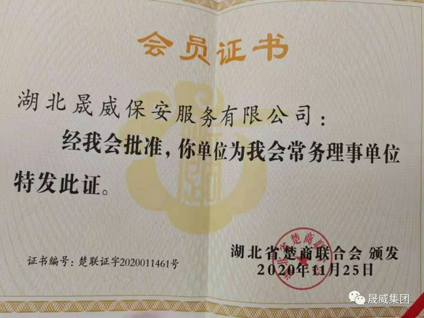 晟威集团旗下晟威保安公司当选为湖北省楚商联合会常务理事单位