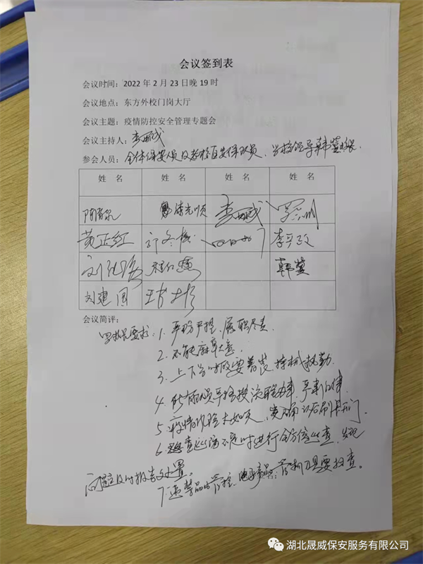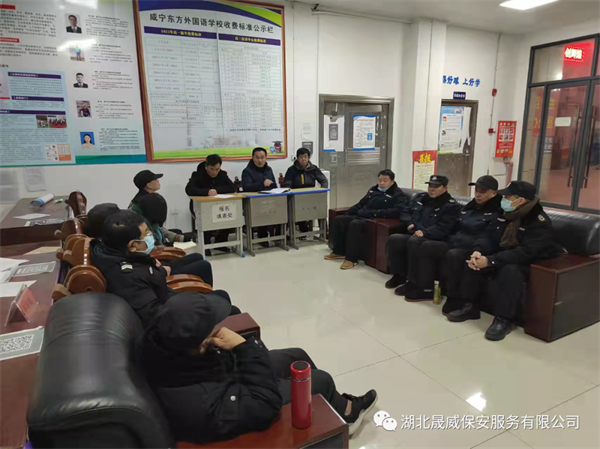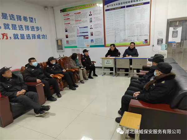 2月23日晚上,湖北晟威保安咸宁分公司在咸宁东方外国语学校,召开疫情防控工作紧急会议,传达最新的疫情防控情况。东方外校韩冀校长、罗会明副校长、保卫科李主任、驻校全体保安队员及老校区保安队员参加了会议。会上分公司总经理李西成首先通报了武汉最新发现的新冠病毒疫情阳性人员情况。2022年2月21日下午,3名外地来汉人员及1名密接者新冠病毒核酸检测结果为阳性。武汉市疫情防控指挥部立即启动应急响应机制,全面开展流行病学调查、相关人员排查、采样检测和隔离管控,落实相关场所及环境终末消毒等防疫措施。