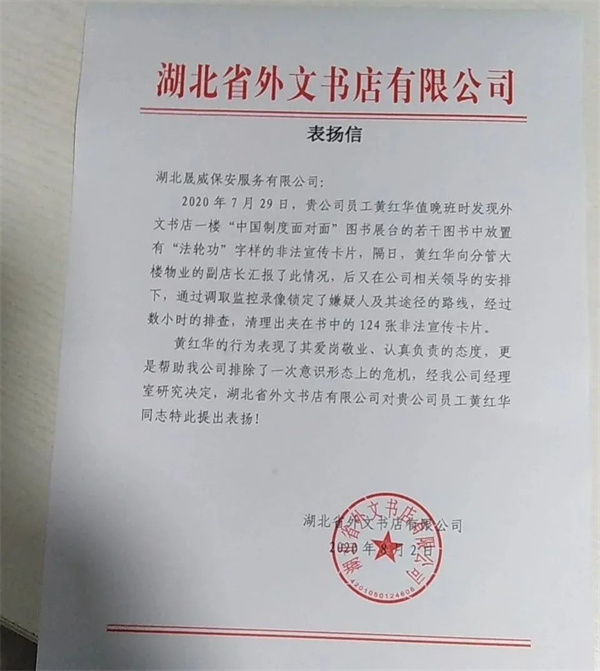 7月29日,湖北晟威公司驻省外文书店项目点保安员黄红华,在值班过程中,发现部分书籍被不法份子插入发轮功宣传卡片,黄红华高度重视,第一时间向上级领导报告,协助调取监控,最后锁定犯罪嫌疑人,并清理出非法宣传卡124张。