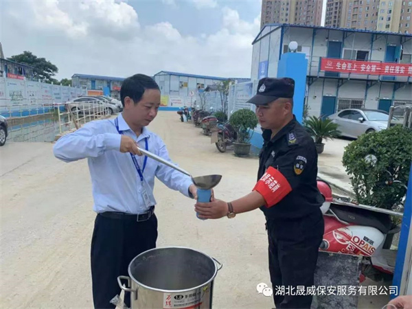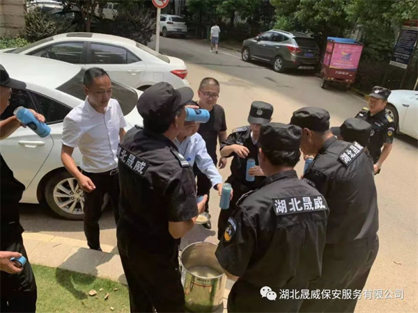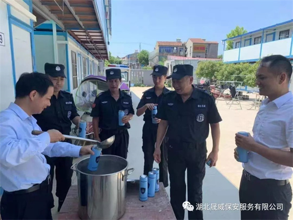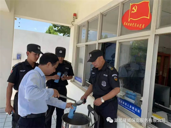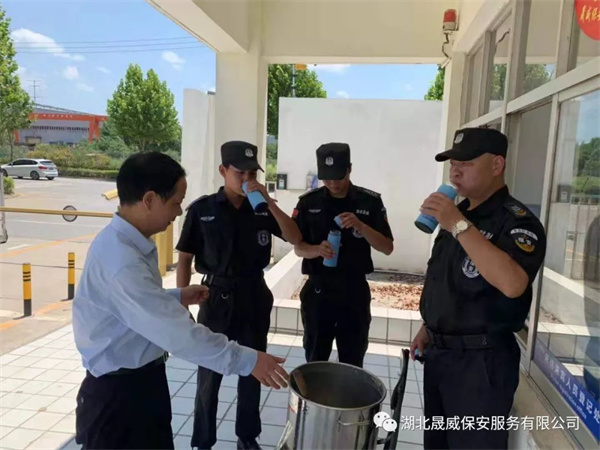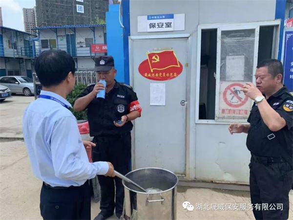 进入七月以来,武汉持续高温,热浪滚滚,湖北晟威(武汉)分公司保安员不顾炎热,仍然坚守在工作岗位上,为客户单位平安稳定抛洒汗水。湖北晟威公司组织专人专班,精心熬制绿豆汤,为一线员工送去解暑绿豆汤,送上一份“清凉”。