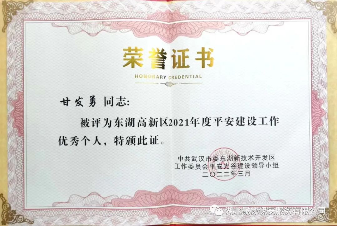 近日,武汉市东湖新技术开发区工作委员会平安光谷建设领导小组,授予湖北晟威集团党总支书记、董事长甘发勇“2021年度平安建设工作优秀个人”荣誉称号。这也是武汉市东湖高新区对湖北晟威集团工作的高度认可,湖北晟威集团全体工作人员,将不忘初心、牢记使命、再接再厉,不断做大做强企业实力,为武汉市经济社会发展作出新贡献,以优异成绩迎接党的二十大胜利召开。