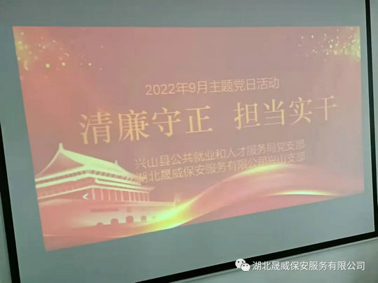 晟威保安兴山公司党支部书记甘元态表示:这次联合开展的主题党日活动很有意义,我们要抓实廉洁教育,以正气充盈的政治文化,温润党员干部的思想和灵魂,永葆党的肌体健康、活力充沛。要加强政治教育,经常进行思想政治体检,切实把纪律和规矩挺在前面,以铁的纪律维护党中央权威和集中统一领导。作为服务型企业,我们要讲政治,提升服务质量,注重服务细节,不断增强本领,为兴山县经济社会稳定发展贡献力量,以昂扬向上的姿态,迎接国庆到来和党的二十大胜利召开。
