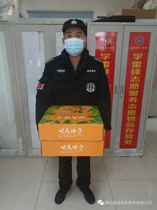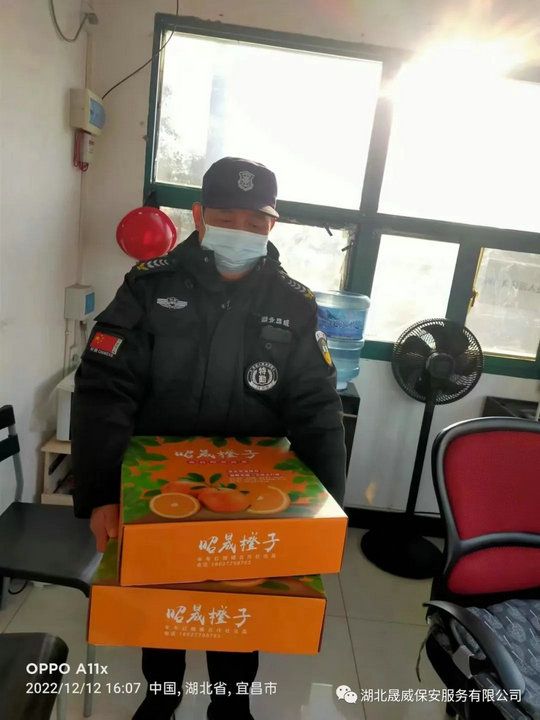 近日,湖北晟威保安宜昌分公司负责人袁选俊带领办公室管理人员,深入宜昌第一中学、第五人民医院等各项目点开展年底慰问活动,并为值班值守队员送去昭晟脐橙等慰问品,对奋战在抗疫及工作一线的队员送去党组织的亲切关怀。