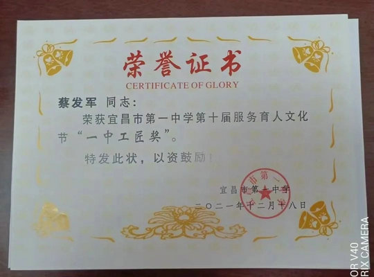 近日,湖北晟威保安宜昌分公司驻宜昌市第一中学保安员蔡发军同志,因工作认真负责,任劳任怨,受到客户单位好评,被评为该校第十届服务育人文化节“一中工匠奖”荣誉称号,特别是蔡发军同志在保安工作中注重学习,胆大心细,在平凡的岗位上展现了不平凡,得到学校领导高度认可。