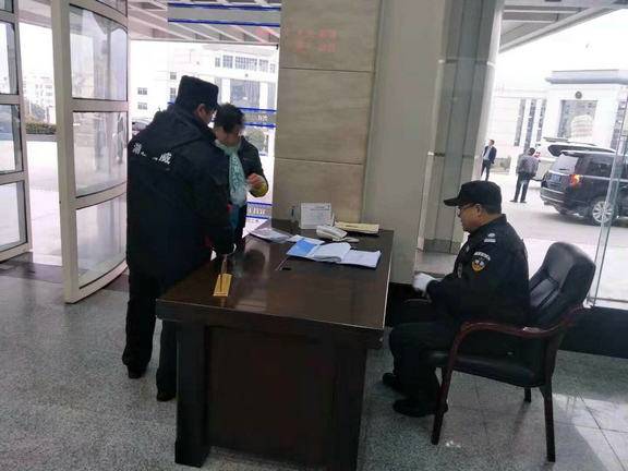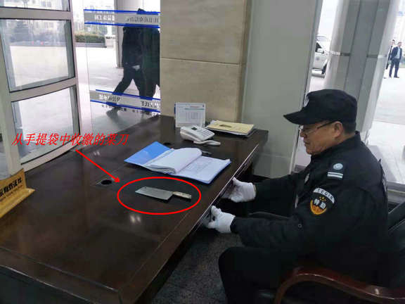 2018年12月10日上午湖北晟威保安公司某政府单位保安队队员刘祖盛、王三星、向金昌正在日常执勤过程中,一名不明身份的中年妇女意图擅自闯入政府大楼,扬言要找政府领导,当即被我公司保安员拦下询问要求联系被访人。在询问过程中,该名女子不听保安员劝阻,态度强硬,执意要冲入领导办公室。此时,保安员刘祖盛发现她神态紧张,有些反常,要求开包检查,检查中发现女子手提袋内有一把菜刀,于是立即将此人控制并收缴菜刀,同时向保安队负责人汇报了情况。负责人按公司工作流程随即报告给政府领导并报警,8点30分左右,警察来到现场对事情进行处理,并将该女子带走。
